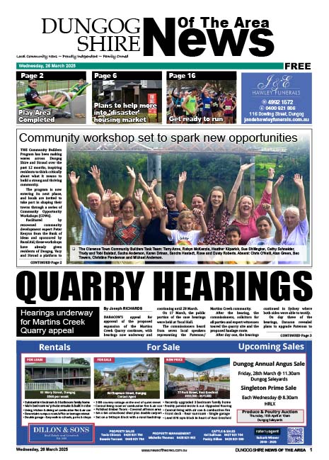 Printed Edition Dungog Shire News Of The Area 26 MARCH 2025 March 26, 2025April 14, 2025 You can help your local paper. Make a small once-off, or (if you can) a regular donation. We are an independent family owned business and our newspapers are free to collect and our news stories are free online. Help support us into the future. Read more articles Previous PostDungog Shire News Of The Area 19 MARCH 2025Next PostDungog Shire News Of The Area 2 APRIL 2025