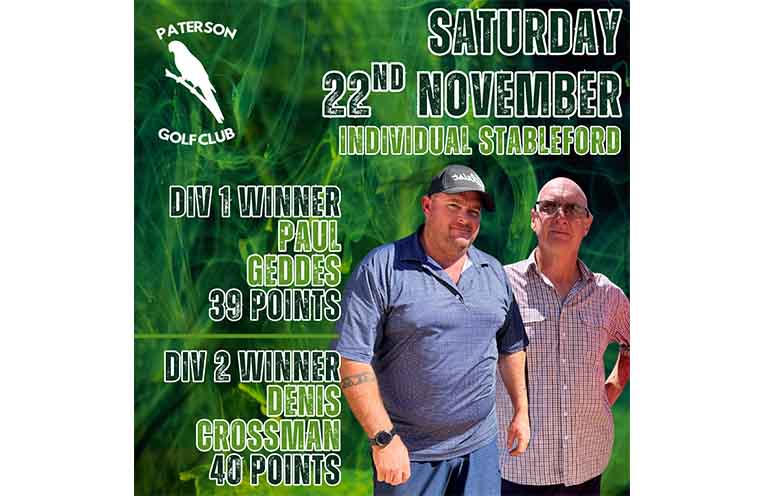 SATURDAY 22ND NOVEMBER INDIVIDUAL STABLEFORD FIELD | 35 members & 3 visitors DIVISION 1 (<15) | Winner Paul Geddes (9) 39 Points, Runner Up Michael Mirisch (13) 39 Points, 3rd Place Robert Richardson (14) 38 Points DIVISION 2 (16-36) | Winner Denis Crossman (20) 40 Points, Runner Up Greg Sainsbury (20) 40 Points, 3rd Place Benjamin Herden (21) 37 Points BALL COMP | Stephen Watson (14) 38 Points, Peter Nicholson (15) 36 Points, Paul Monaghan (7) 35 Points, Glenn Davies (6) 35 Points, Greg Scott (4) 35 Points, Greg Kellner (19) 35 Points, Peter Griffin (19) 35 Points, Brodie Thackeray (11) 35 Points, Wayne Stedman (10) 34 Points, Allan McKinnon (12) 34 Points, John Walker (11) 34 Points, Joseph Gleeson (17) [Shortland Waters] 34 Points, Darren Crear (10) [Hunter Valey] 34 Points & Michael Cairney (26) 34 Points. NEAREST THE PIN | 1st/10th – Brodie Thackeray (11), 5th/14th – Michael Cairney (26), 7th/16th – Ted Zawirski (30) MEMBERS DRAW | No.42, Jackpot, $267.50 MEMBERS EAGLES NEST | Unclaimed – 2 Balls UPCOMING EVENTS | 29-Nov Individual Stableford, 2BBB & Match Play Championships (Final), 6-Dec Individual Stroke & Monthly Medal, 13-Dec Individual Stableford & Christmas Ham Day (7:30am shotgun start), 20-Dec Individual Stableford, Kevin Rudd & Roy Bishop Trophy (7:30am shotgun start), 27-Dec Individual Stableford & 2BBB. Schedule subject to change.