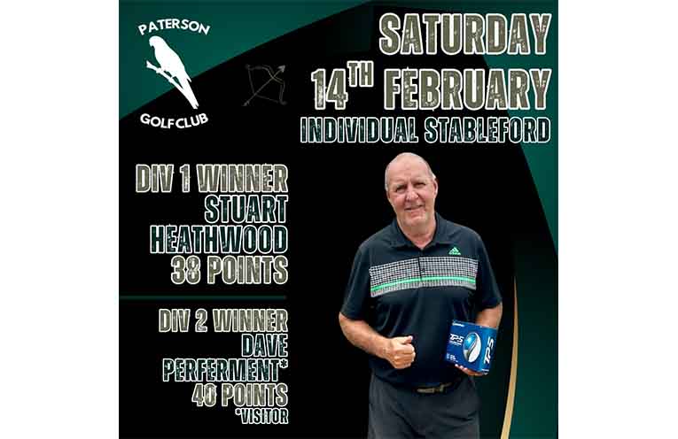 SATURDAY 14TH FEBRUARY INDIVIDUAL STABLEFORD FIELD | 35 members & 3 visitors. DIVISION 1 (<15) | Winner Stuart Heathwood (15) 38 Points, Runner Up Robert Richardson (12) 37 Points, 3rd Place Glenn Davies (6) 35 Points DIVISION 2 (16-36) | Winner Dave Perferment (22) [Muswellbrook] 40 Points, Runner Up Denis Crossman (19) 37 Points, 3rd Place Joseph Jackson (23) 36 Points BALL COMP | Darren Mathers (18) 36 Points, Greg Kellner (17) 35 Points, Banjo Rose (29) 35 Points, Michael Cairney (26) 34 Points, Daniel Szokolai (11) 34 Points, Michael Rose (5) 34 Points, Peter Nicholson (12) 33 Points, Michael Shanley (16) 32 Points, Brian Mowle (14) 32 Points & Benjamin Herden (20) 32 Points. NEAREST THE PIN | 2nd/11th – Lee Hunt (10), 7th/16th – Broc Hunt (16), 8th/17th – Michael Rose (5) MEMBERS DRAW | No.63, Dion Rose (34th/37), $37 won, $37 carries forward MEMBERS EAGLES NEST | Michael Rose (5) – 8th & 15th – 11 Balls UPCOMING EVENTS | 21-Feb Individual Stableford, 28-Feb Individual Stableford, 7-Mar Individual Stroke & Monthly Medal, 14-Mar Individual Stableford, 21-Mar Individual Stableford, 25-Mar Course Renovations, 28-Mar Individual Stableford. Schedule subject to change.