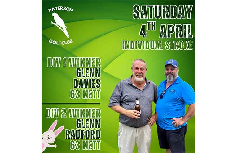 SATURDAY 4TH APRIL INDIVIDUAL STROKE & MONTHLY MEDAL FIELD | 26 members & 5 visitors. DIV 1 (<15) | Winner Glenn Davies (6) 63 Nett, Runner Up Paul Geddes (5) 63 Nett DIV 2 (16-36) | Winner & Monthly Medal Glenn Radford (22) 63 Nett, Runner Up Greg Sainsbury (19) 68 Nett BALL COMP | Luke Glendenning (11) [Maitland] 64 Nett, Robert Richardson (12) 65 Nett, Lee Hunt (10) 66 Nett, Troy Barry (23) [Hunter Valley] 66 Nett, Daniel Kelly (22) [Maitland] 66 Nett, Michael Shanley (15) 67 Nett. Stephen Pilgrim (14) 67 Nett & Christopher Burg (13) 67 Nett. PUTTING COMP | Div 1 – Robert Richardson (12) – 28 Putts, Div 2 – Michael Dobosz (23) – 29 Putts NEAREST THE PIN | 1st/10th – Brian Wright (23), 2nd/11th – James Cowled (12), 5th/14th – Brian Mowle (14) MEMBERS DRAW | No.73, Jackpot, $289.75 MEMBERS EAGLES NEST | Unclaimed – 2 Balls UPCOMING EVENTS | 11-Apr Individual Stableford, 18-Apr Individual Stableford, 25-Apr Individual Stableford (8am shotgun start), 2-May Individual Stroke & Monthly Medal, 9-May Individual Stableford, 16-May 2-Person Ambrose Championships (1st Round), 23-May 2-Person Ambrose Championships (Final Round), 30-May Individual Stableford. Schedule subject to change.