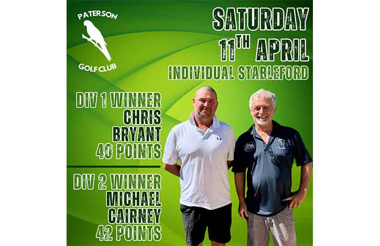 SATURDAY 11TH APRIL INDIVIDUAL STABLEFORD FIELD | 34 members DIV 1 (<15) | Winner Chris Bryant (8) 40 Points, Runner Up Peter Nicholson (12) 40 Points, 3rd Place Michael Rose (5) 38 Points DIV 2 (16-36) | Winner Michael Cairney (24) 42 Points, Runner Up Dion Rose (36) 41 Points, 3rd Place Cain Gorfine (19) 40 Points BALL COMP | Benjamin Herden (19) 39 Points, Allan McKinnon (13) 38 Points, Greg Scott (6) 38 Points, Stephen Watson (13) 37 Points, Timothy Kiem (9) 36 Points, Paul Geddes (5) 36 Points, Ramsey Vane-Wood (6) 35 Points & Michael Shanley (15) 35 Points. NEAREST THE PIN | 6th/15th – Michael Rose (5), 8th/17th – Michael Rose (5), 9th/18th – Greg Kellner (18) MEMBERS DRAW | No.8, Fred Cox (20th/34), $178.88 won ($178.87 carries forward) MEMBERS EAGLES NEST | Unclaimed – 3 Balls UPCOMING EVENTS | 18-Apr Individual Stableford, 25-Apr Individual Stableford (8am shotgun start), 2-May Individual Stroke & Monthly Medal, 9-May Individual Stableford, 16-May 2-Person Ambrose Championships (1st Round), 23-May 2-Person Ambrose Championships (Final Round), 30-May Individual Stableford. Schedule subject to change.