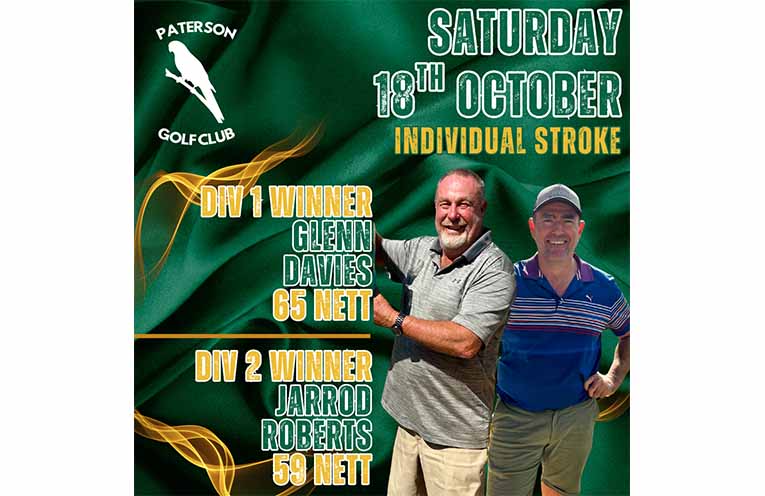 SATURDAY 18TH OCTOBER INDIVIDUAL STROKE & MALE CLUB CHAMPIONSHIPS (2ND ROUND) FIELD | 38 members & 1 visitor. DIVISION 1 (<15) | Winner Glenn Davies (5) 65 Nett, Runner Up James Cowled (10) 65 Nett, 3rd Place Stephen Dunn (13) [Toronto] 66 Nett DIVISION 2 (16-36) | Winner Jarrod Roberts (17) 59 Nett, Runner Up Michael Croucher (21) 62 Nett, 3rd Place Greg Kellner (19) 66 Nett BALL COMP | John Walker (11) 66 Nett, Brodie Thackeray (10) 66 Nett, Denis Crossman (21) 66 Nett, Robert Radin (18) 67 Nett, Simon Dunn (8) 67 Nett, Greg Scott (5) 67 Nett, Brian Rohr (23) 67 Nett, Peter Nicholson (15) 67 Nett, Paul Geddes (11) 68 Nett, Stuart Heathwood (17) 68 Nett & Allan Mckinnon (11) 68 Nett. PUTTING COMP | Div 1 – James Cowled (10) 27 Putts, Div 2 – Greg Kellner (19) 29 Putts NEAREST THE PIN | 2nd/11th – Jarrod Roberts (17), 5th/14th – John Walker (11), 6th/15th – Michael Croucher (21), 8th/17th – Simon Dunn (8) MEMBERS DRAW | No.38, Brian Mowle (22nd/39), $39 ($39 carries foward) MEMBERS EAGLES NEST | Unclaimed – 1 Ball UPCOMING EVENTS | 25-Oct Individual Stroke, Tom Goodman Trophy & Male Club Championships Final Round, 29-Oct Course Renovations (volunteers required), 1-Nov Individual Stroke, Monthly Medal & Match Play Championships (1st Round), 8-Nov Individual Par & Match Play Championships (Quarter Finals), 15-Nov Individual Stableford & Match Play Championships (Semi-Finals), 22-Nov Individual Stableford & Match Play Championships (Final), 29-Nov Individual Stableford & 2BBB. Schedule subject to change.